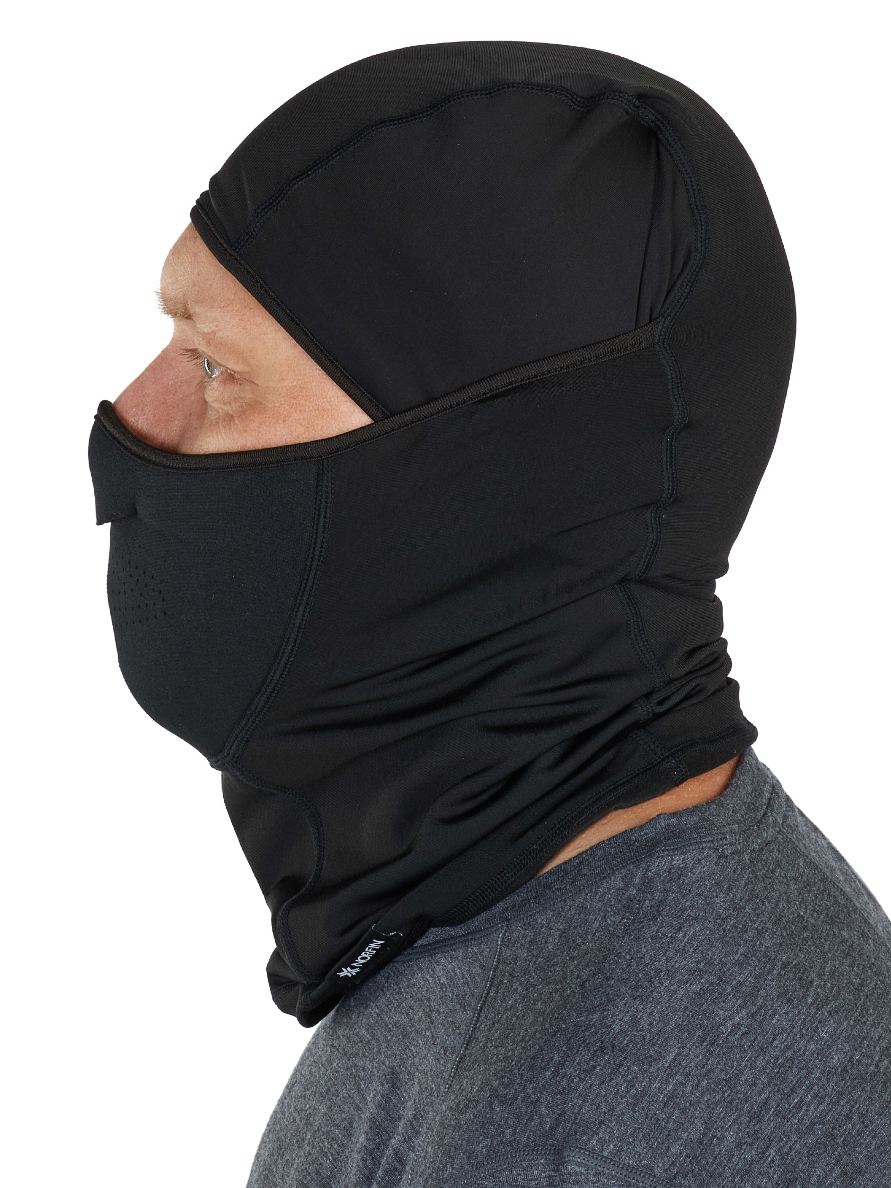 The advanced construction combines a technical windproof barrier at the front exposure zone with stretchy, comfortable fabric throughout the remainder of the mask